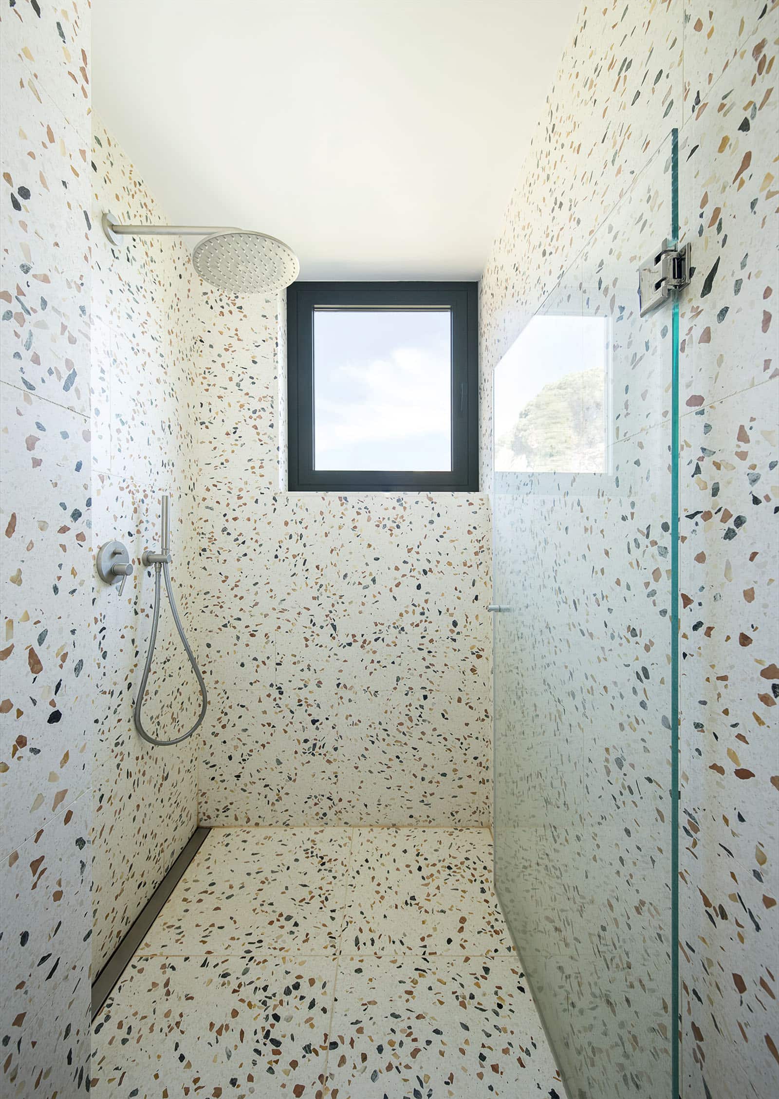 In this bathroom project in particular, it not only acts as a frame, but becomes the authentic material protagonist that surrounds everything, including the shower compartment.
