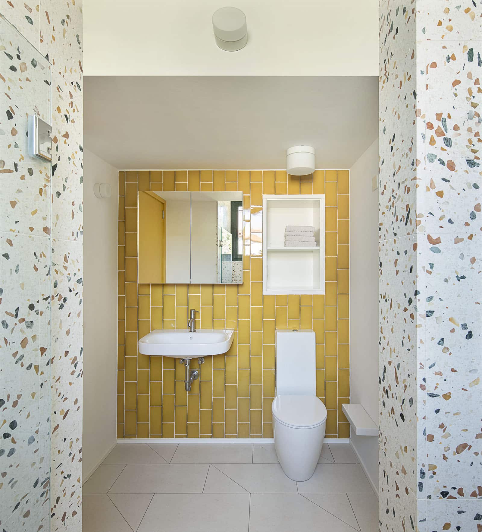 The final result is an environment sprinkled with fragments of color that on the one hand give movement to an otherwise static environment and on the other elegantly match the bright yellow tiled surface and pure white sanitary ware, thanks to the neutral background.