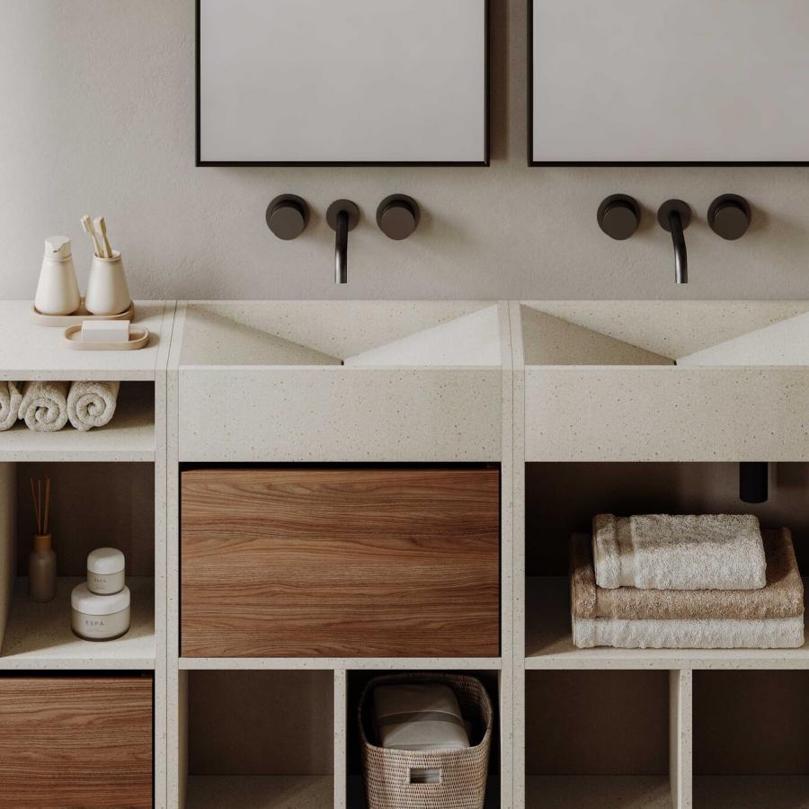 The Monomateria washbasin collection explores the potential of terrazzo with two distinctive models: Blocchi, available in freestanding ("da terra"), countertop ("da appoggio"), and wall-mounted versions ("sospesi"), and Perimetro. Featuring essential geometries and smooth surfaces, this collection enhances the beauty of the natural material and its role in design, enriching Mipa’s vision of Total Living.