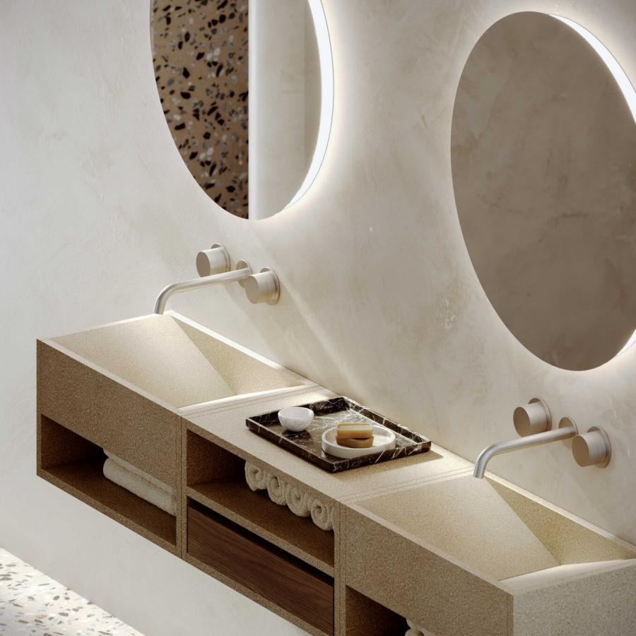 The Monomateria washbasin collection explores the potential of terrazzo with two distinctive models: Blocchi, available in freestanding ("da terra"), countertop ("da appoggio"), and wall-mounted versions ("sospesi"), and Perimetro. Featuring essential geometries and smooth surfaces, this collection enhances the beauty of the natural material and its role in design, enriching Mipa’s vision of Total Living.