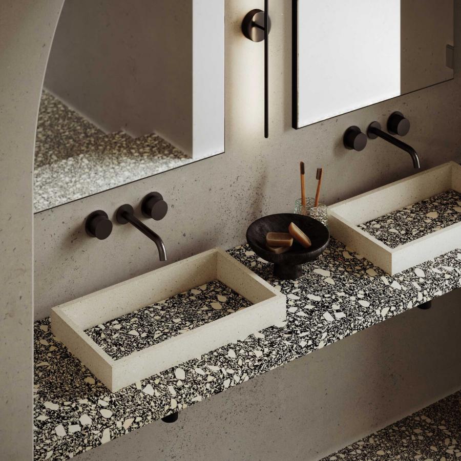 The Monomateria washbasin collection explores the potential of terrazzo with two distinctive models: Blocchi, available in freestanding ("da terra"), countertop ("da appoggio"), and wall-mounted versions ("sospesi"), and Perimetro. Featuring essential geometries and smooth surfaces, this collection enhances the beauty of the natural material and its role in design, enriching Mipa’s vision of Total Living.
