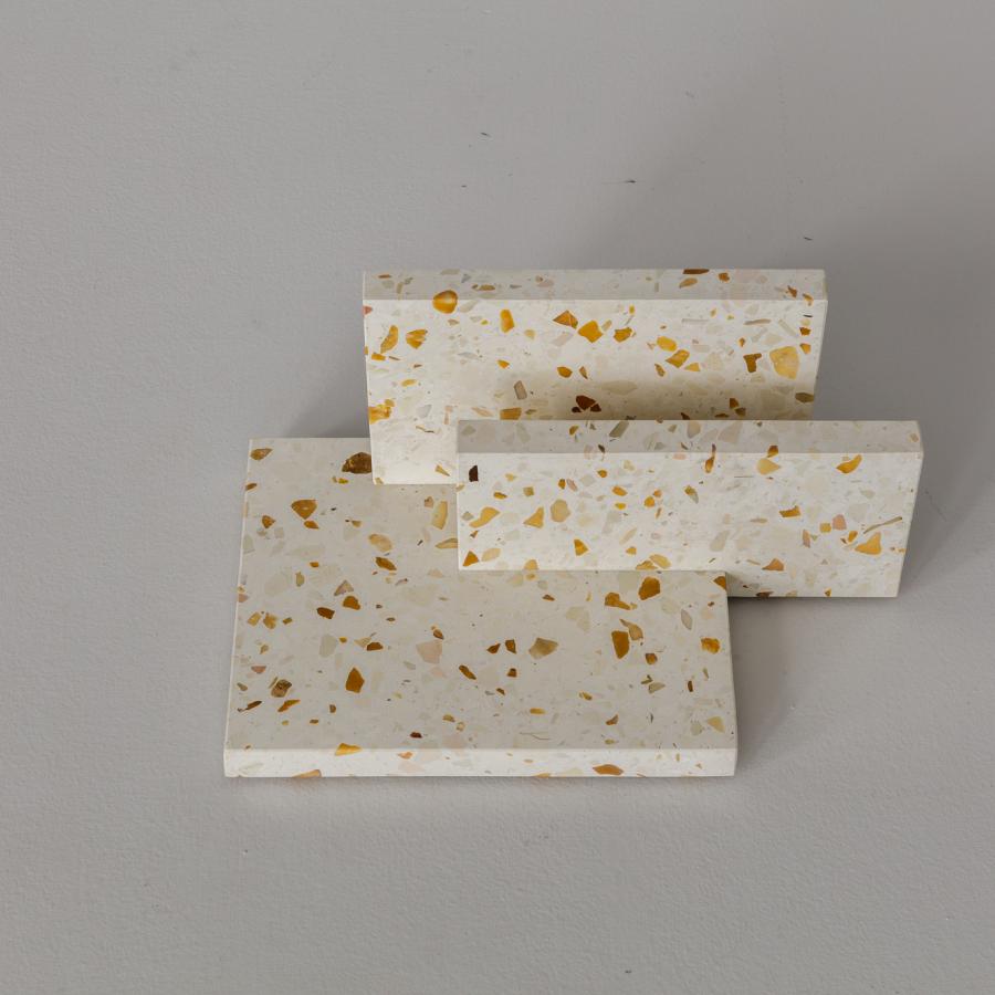 The Piani Concreti pocketemptiers are composed of three thin slabs of graniglia, skillfully set to ensure a secure grip on paper. These exclusive pocketemptiers are offered in three distinctive configurations and feature the unmistakable coloring of our Slabs collection, with the Caramel shade.