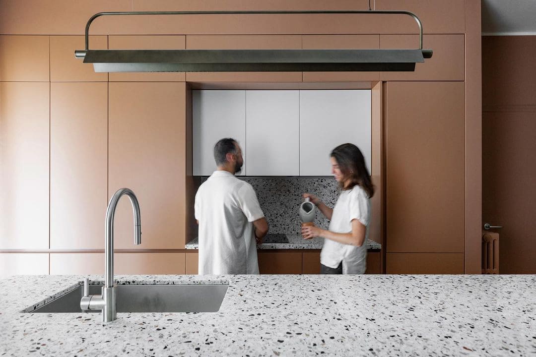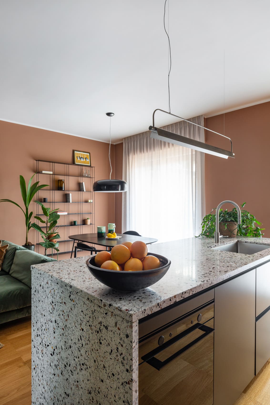 The terrazzo not only adds a touch of modernity and sophistication to the room but also proves to be extremely practical and durable, making it ideal for a daily-use environment like the kitchen.