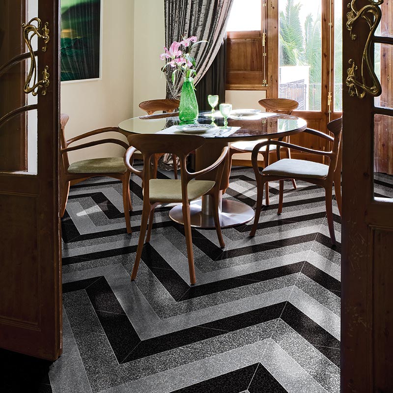 The collection Modulo is the protagonist here with the laying pattern Plain , framed by the contrasting solid color of the “Nero Intenso” boards. Finally, a mix that finds its synthesis in the choice of personalized decorations used to cover the bar area.
