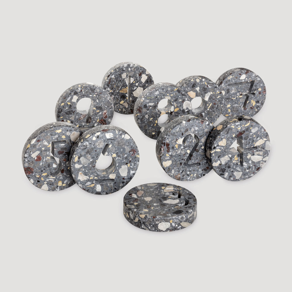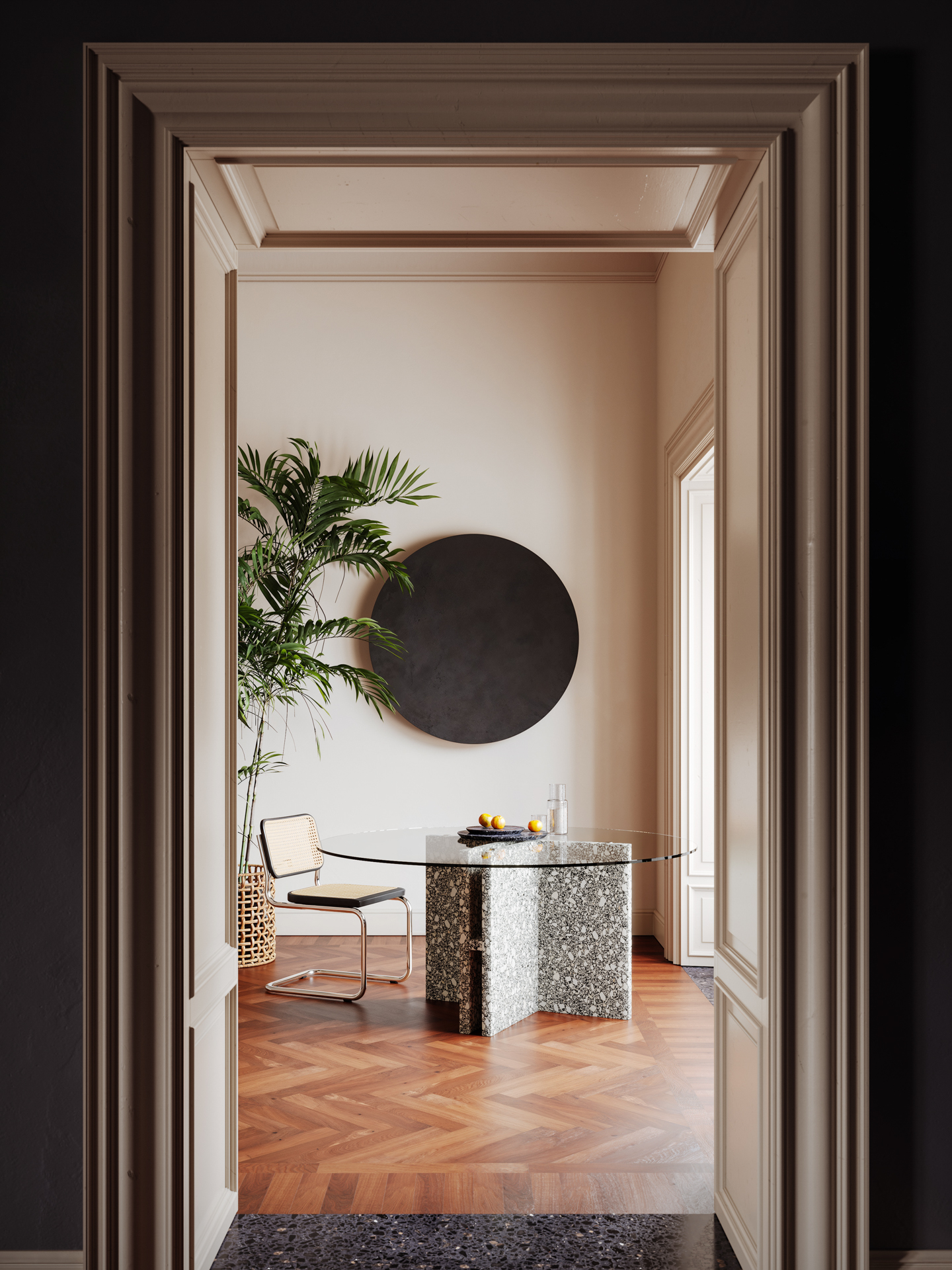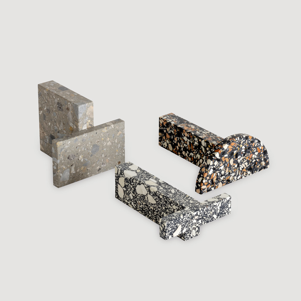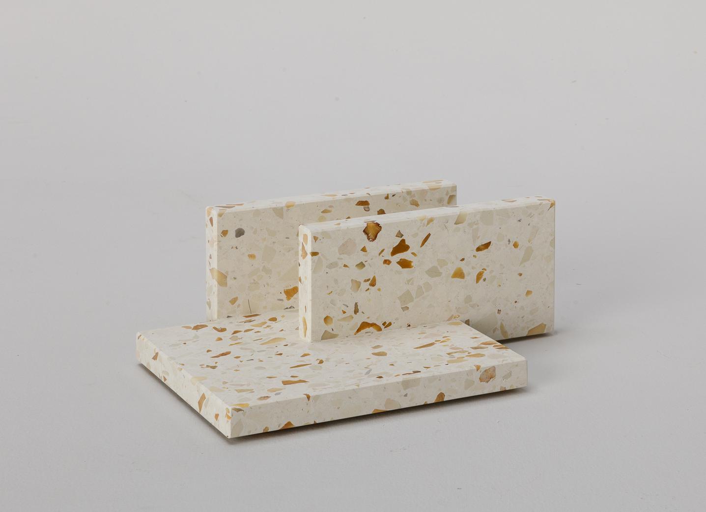 Like a precious archaeological find, the marble emerges in section thanks to a subtle game of millings that show the most elementary aspect of terrazzo in all its charm.