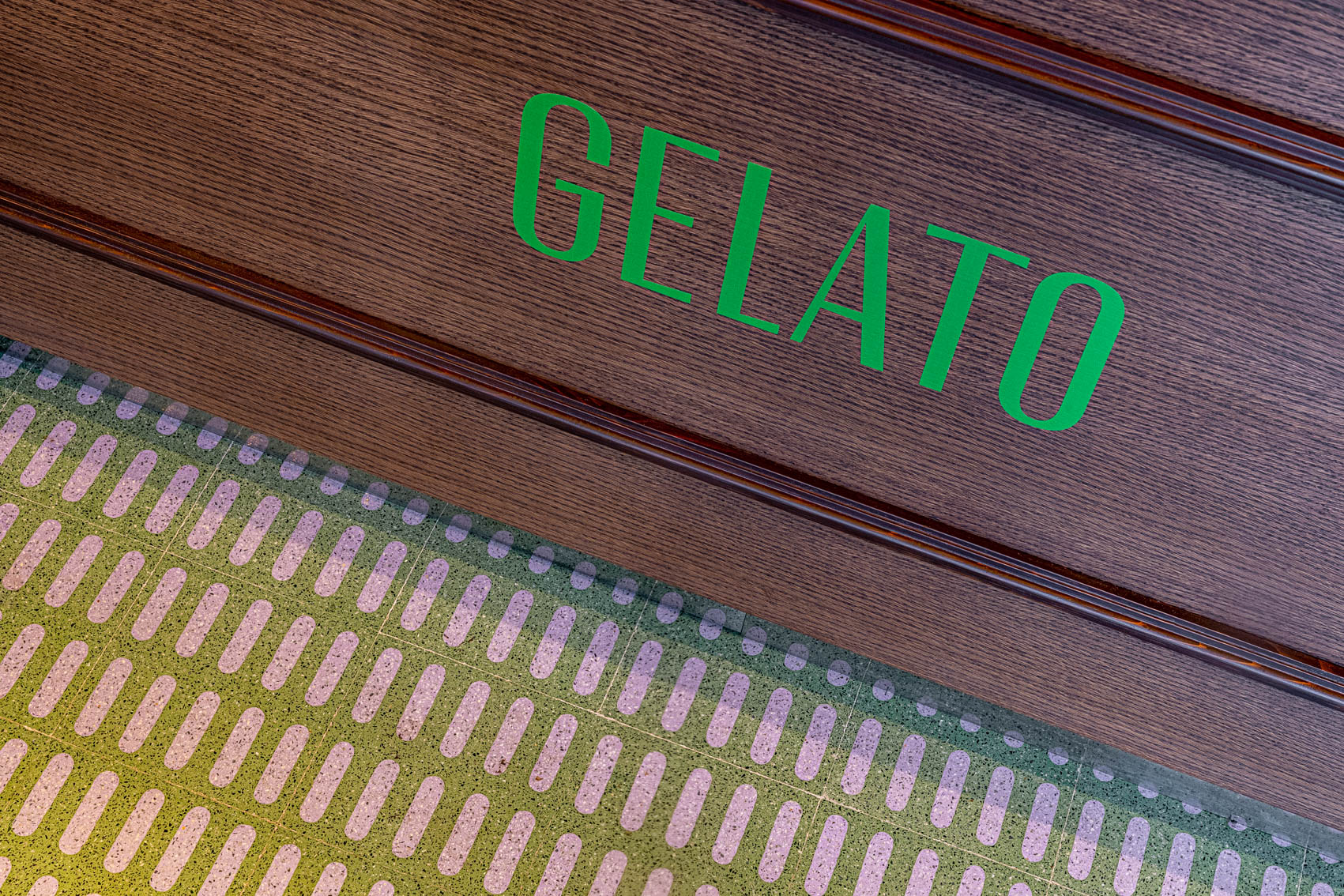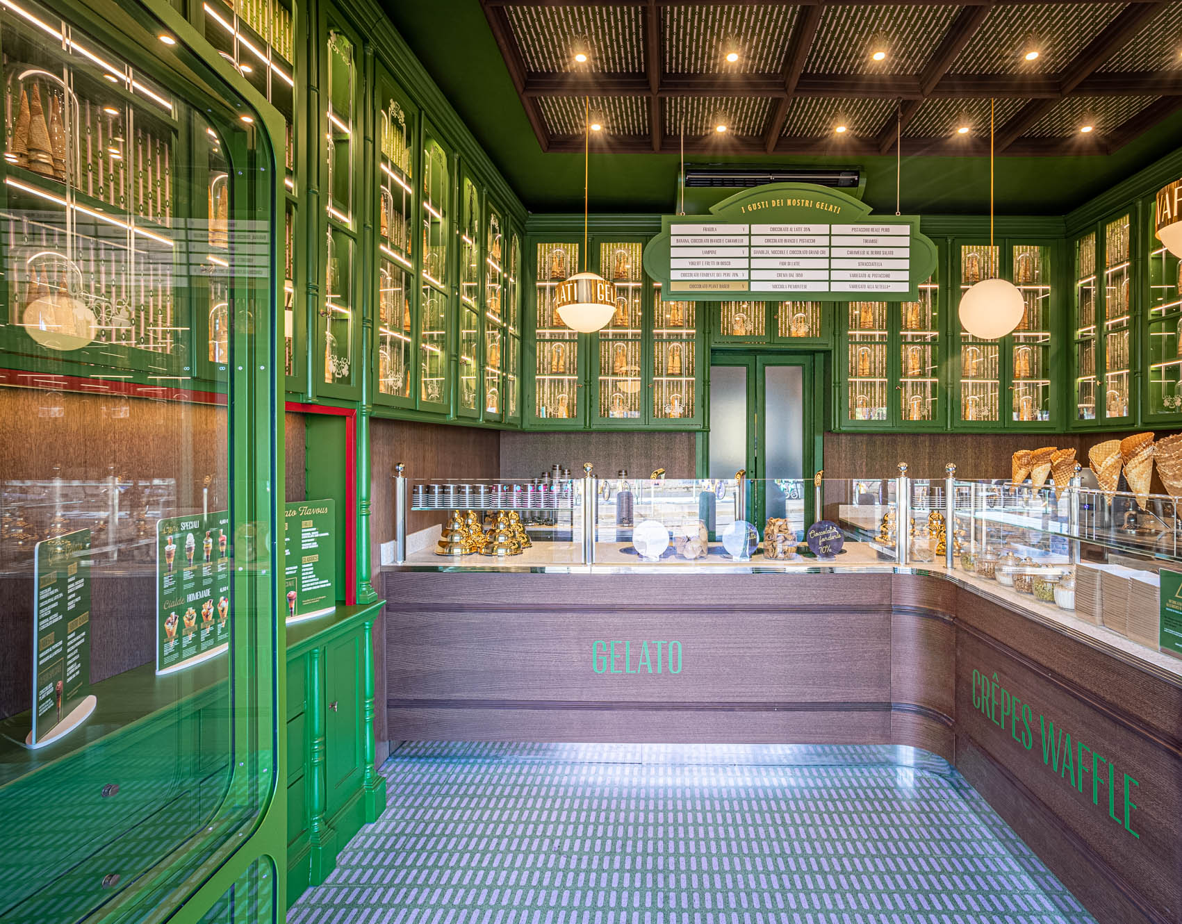 MIPA’s rug-effect marble grit decorative tiles in Fence color kiwi feature in the restyling of one of Milan’s oldest ice cream shops, the Rinomata Gelateria on Naviglio Grande.